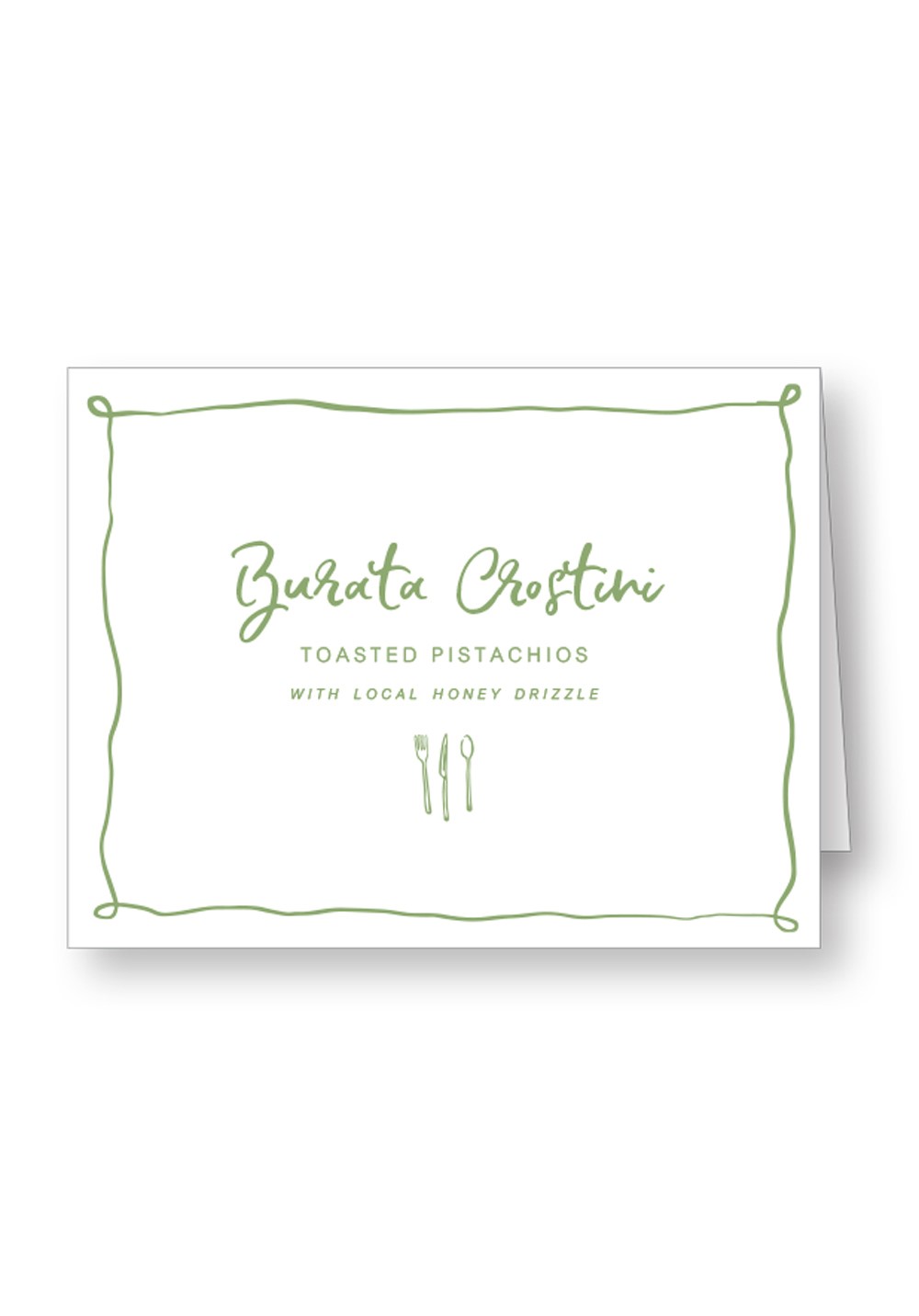 Buffet lines, passed hors d'oeuvres, or assorted cheese plates going to be a part of your reception? Add some signage to let your guests know all the delicious details. Our Food Station & Appetizer Signage is available in a variety of sizes and papers. Choose tented cards to stand on the table or flat cards if you plan to use frames to display them.