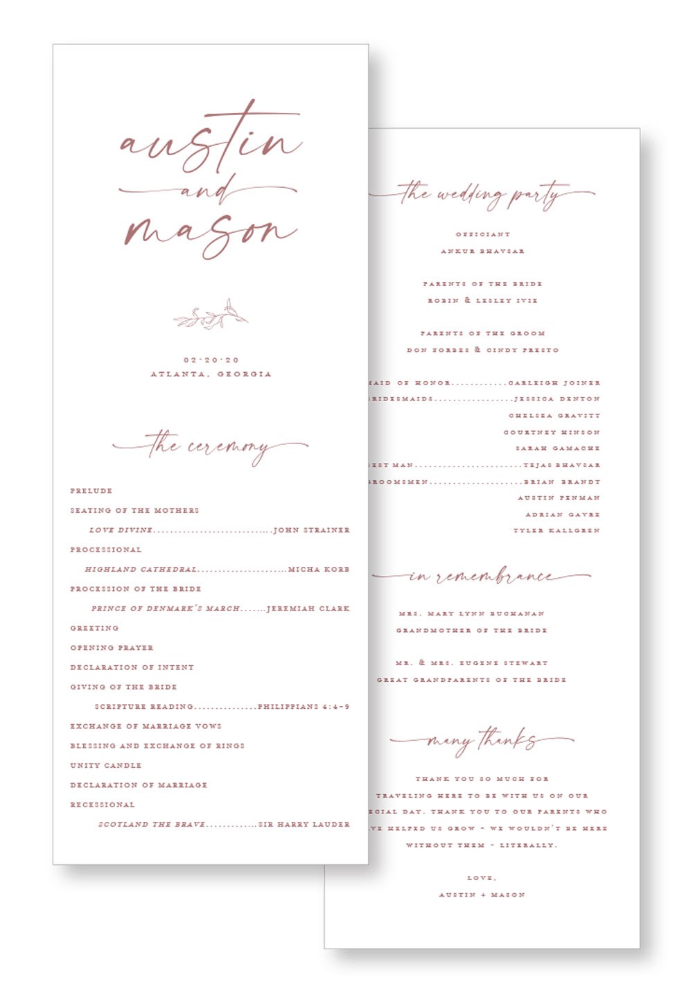 A Program is such a nice way to let your guests know the order of your service and to honor those standing beside you, those who helped you along the way, and those who you'd like to remember who can't be present. Our programs are available as a flat or ready-to-be-folded style card. Add some holes to the spine and you can tie on a beautiful ribbon to complement your wedding colors. Looking for a fan option? We have those too!