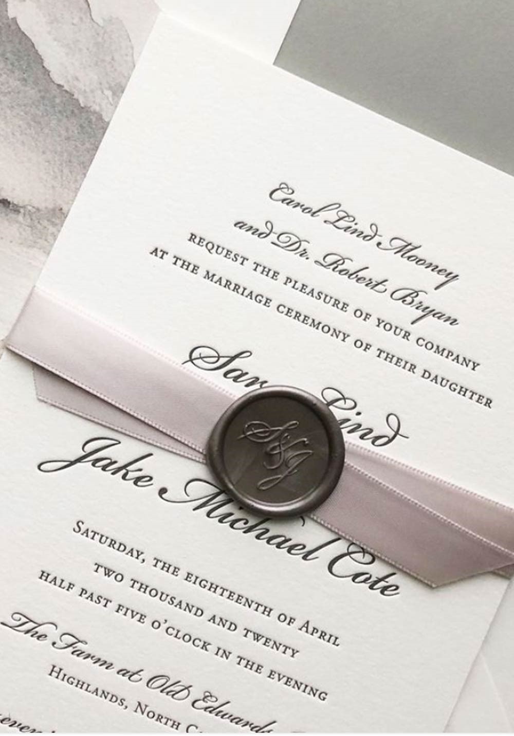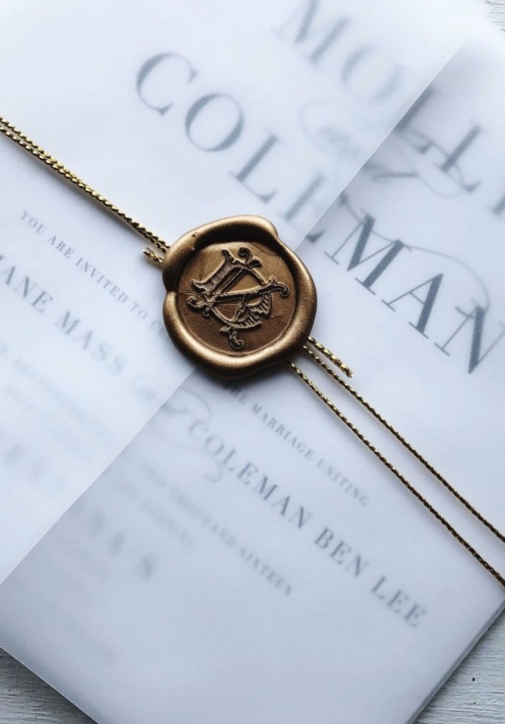 A wax seal is a beautiful way to add a little texture and color to your invitations, save the dates, or even menus! If you decide to add them to your order, we'll add a little dot to your design when we print so you know your seals are perfectly centered when you apply them. If you'd prefer we do the work, then we are happy to apply the wax seals for you! There are a few options to consider, like ordering stickers of wax seals or ordering a stamp to make them yourself and your choice will likely depend on how you want to use the seal. Chat with us for more information and we can answer any questions.